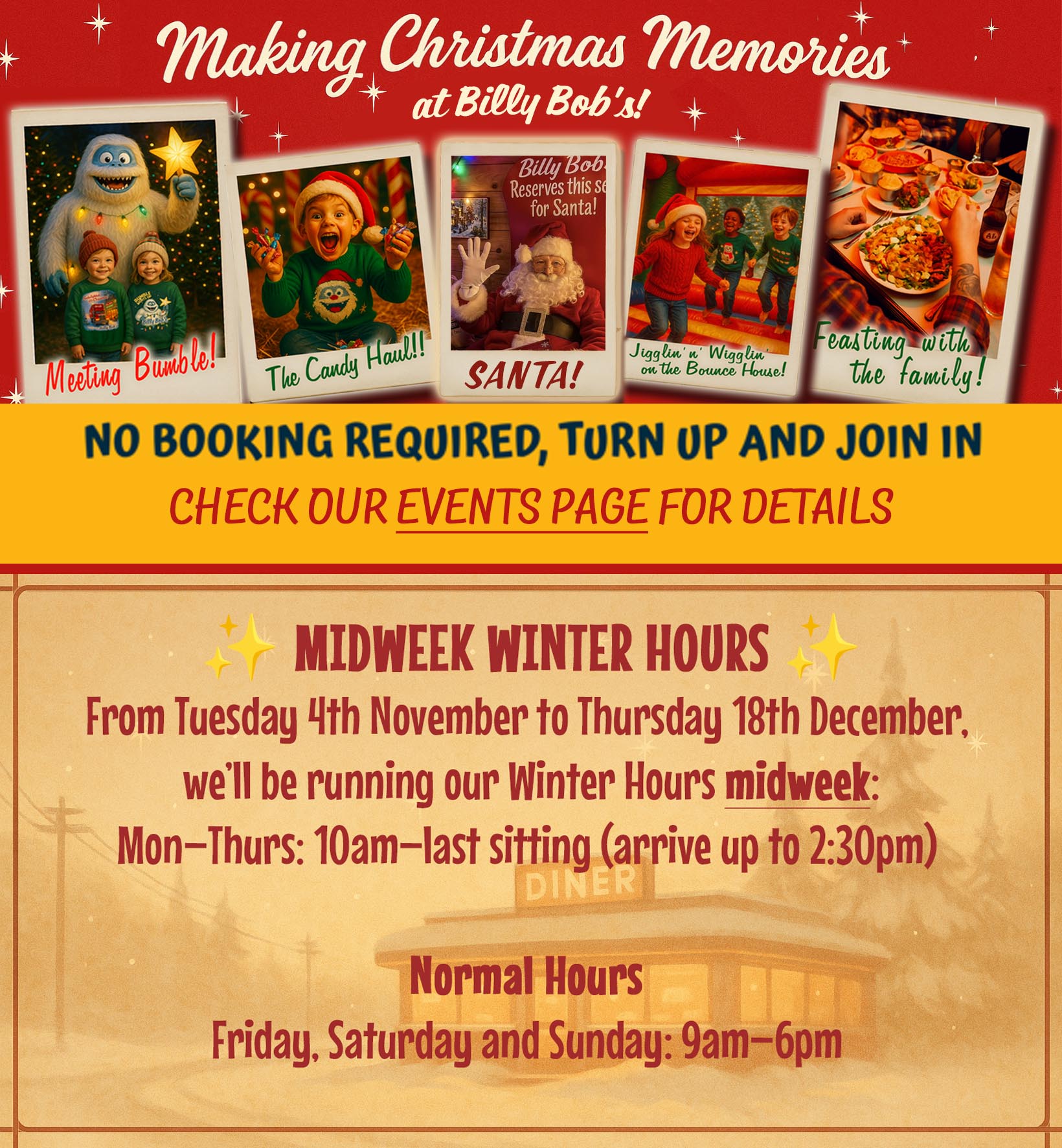 If you’re hankerin’ after seats on the Yellow School Bus (tables seat 4 max); the Coca Cola Truck; need accessible seating; space for a pram or want to put your name to a favourite booth – be sure to tell us.